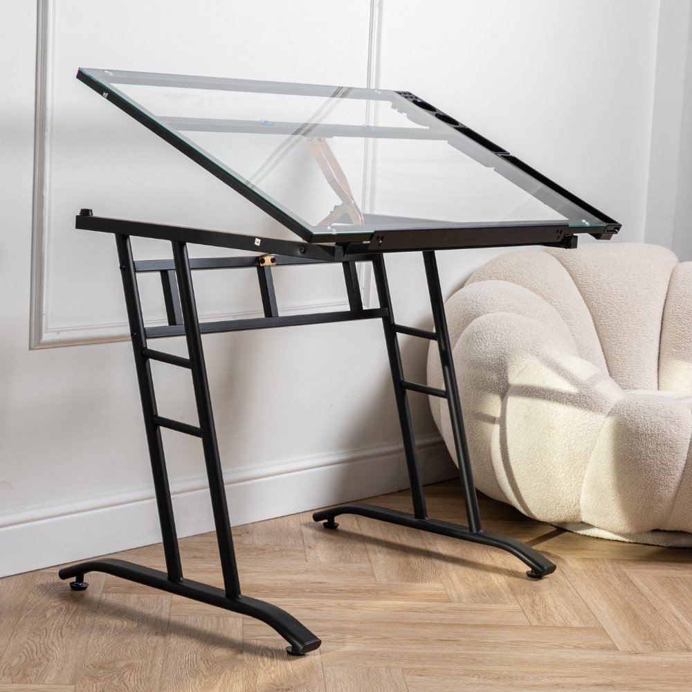 - Прочность, стиль, практичность: Столешница из закаленного стекла – это невероятно прочная, устойчивая к царапинам и легко очищаемая поверхность. Она идеально подходит для работы с любыми материалами и придает столу современный, стильный вид. Надежная металлическая опора гарантирует исключительную устойчивость даже при максимальном наклоне.