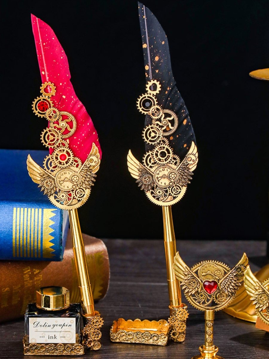 В этом наборе индустриальная мощь стимпанка встречается с живой природой. Зеленое перо — словно осколок старого леса, случайно попавший в мир шестеренок и металла. Или, может быть, это секрет алхимика, который наконец-то нашел способ соединить механику и магию? Держать такую ручку в руках — уже маленькое приключение.